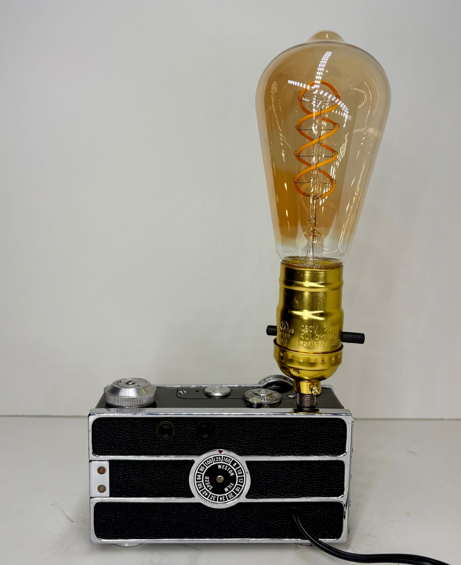 La cámara Argus Coated Cintar fue manufacturada entre 1939 al 1966 aproximadamente. Las cámaras son de las piezas favoritas de nuestra línea. Reciclamos antigüedades que ya no estén en su uso principal. Esta creado con bombilla LED esta tecnología es más eficiente ya que no emite calor y es baja en consumo.