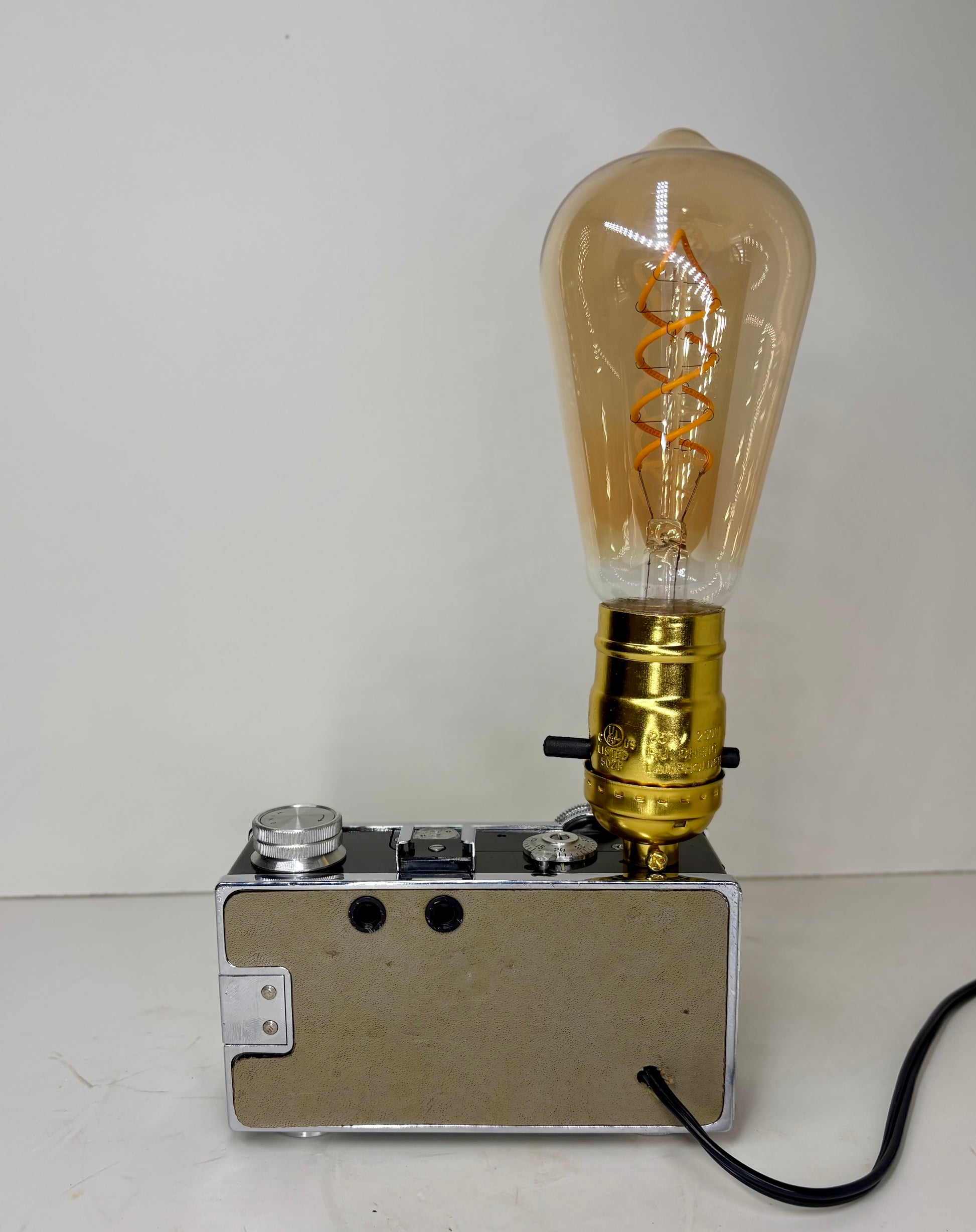 La cámara Argus Coated Cintar fue manufacturada entre 1939 al 1966 aproximadamente. Las cámaras son de las piezas favoritas de nuestra línea. Reciclamos antigüedades que ya no estén en su uso principal. Esta creado con bombilla LED esta tecnología es más eficiente ya que no emite calor y es baja en consumo.