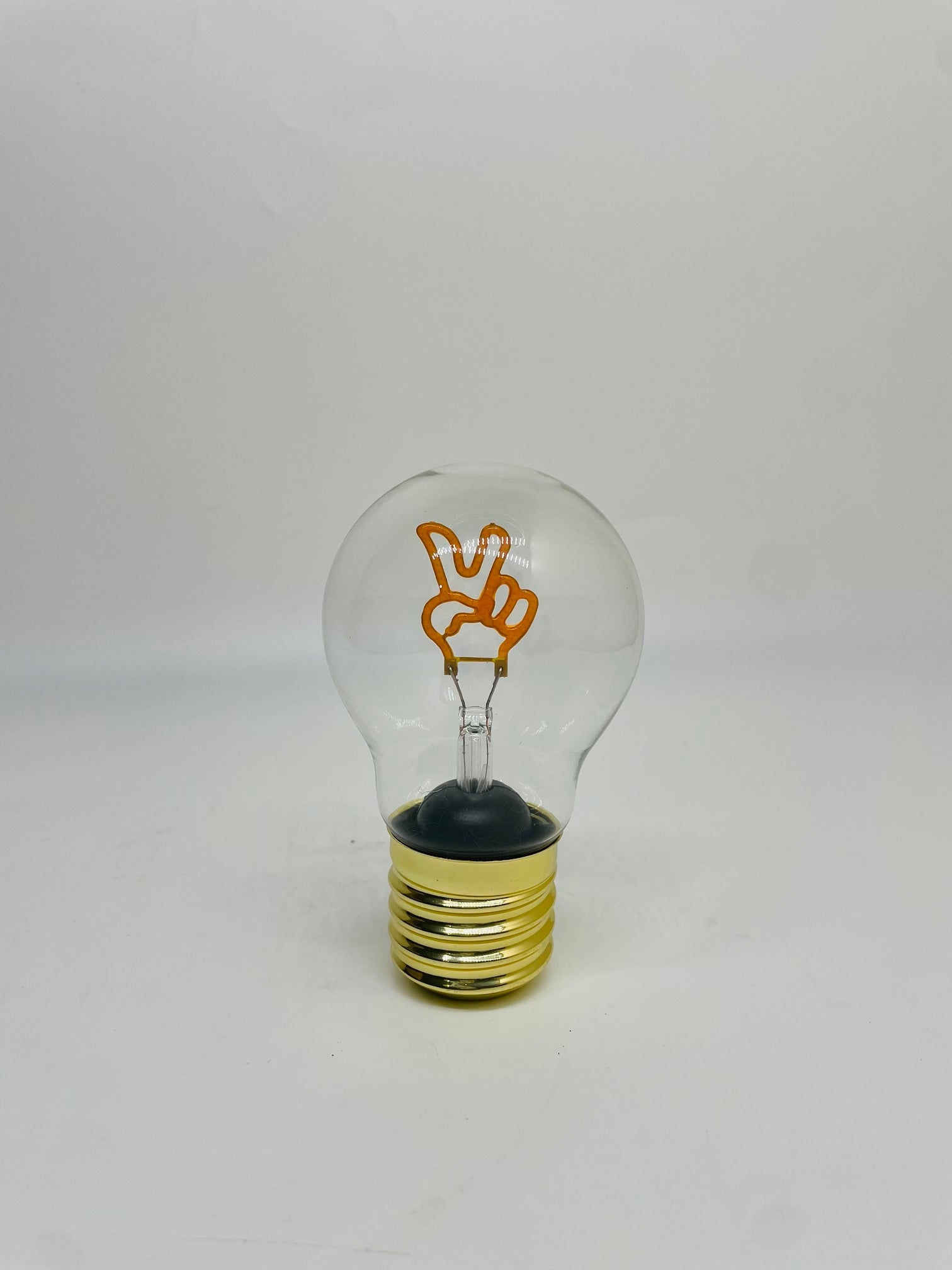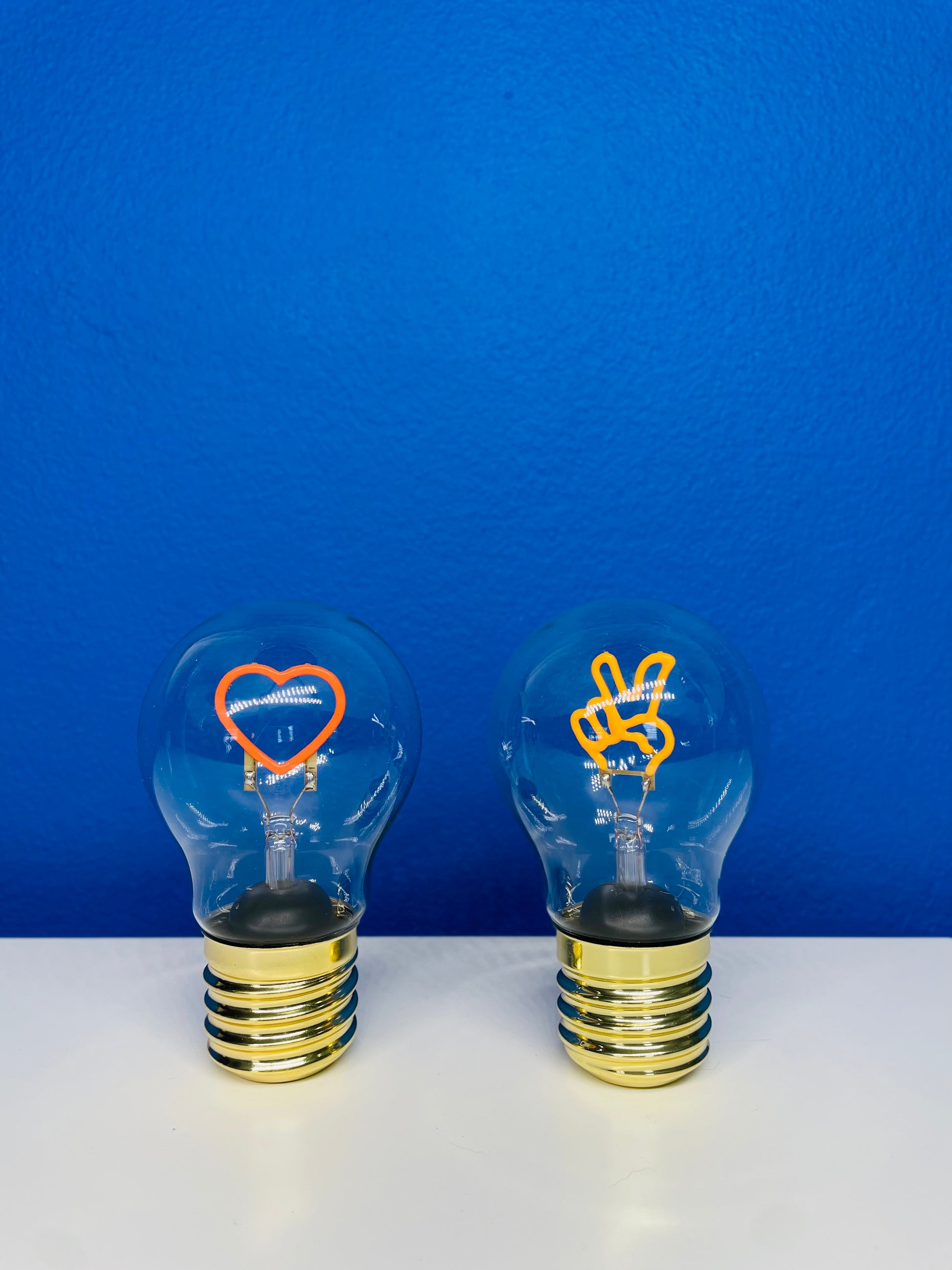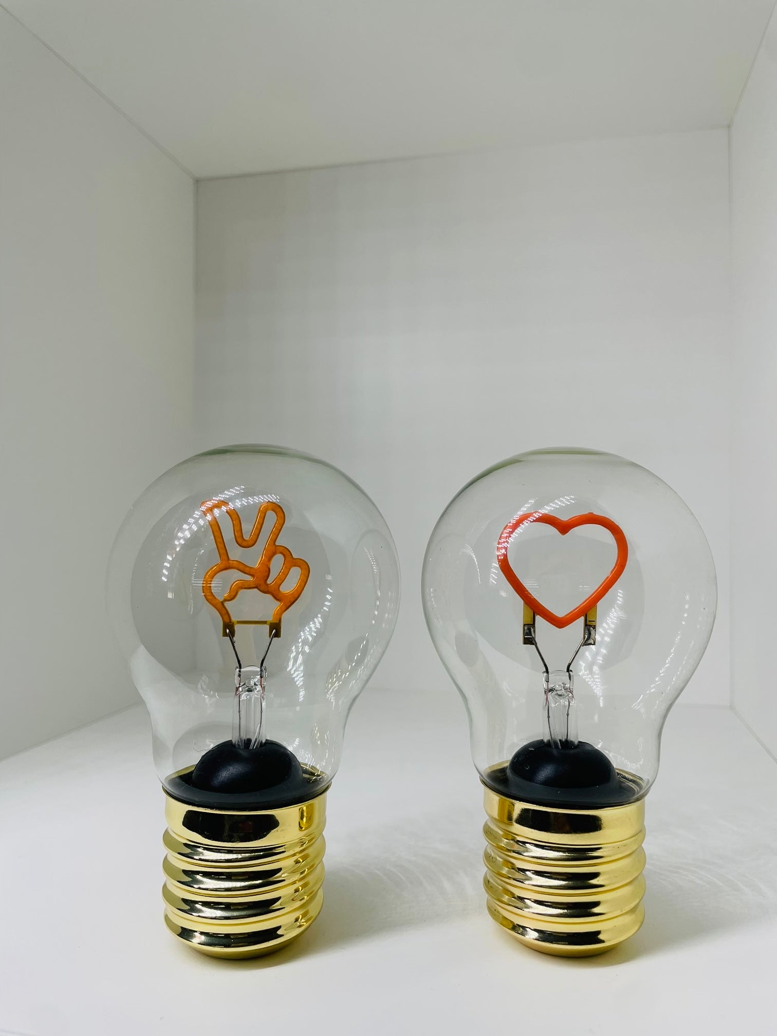 La bombilla recargable tiene un filamento rosa en su interior (el corazón), mientras que el símbolo de la paz tiene un filamento amarillo cálido dentro de una bombilla transparente. Alimentado por una batería recargable USB (cable incluido), proporciona 4 horas de luz después de aproximadamente 90 minutos de tiempo de carga.
