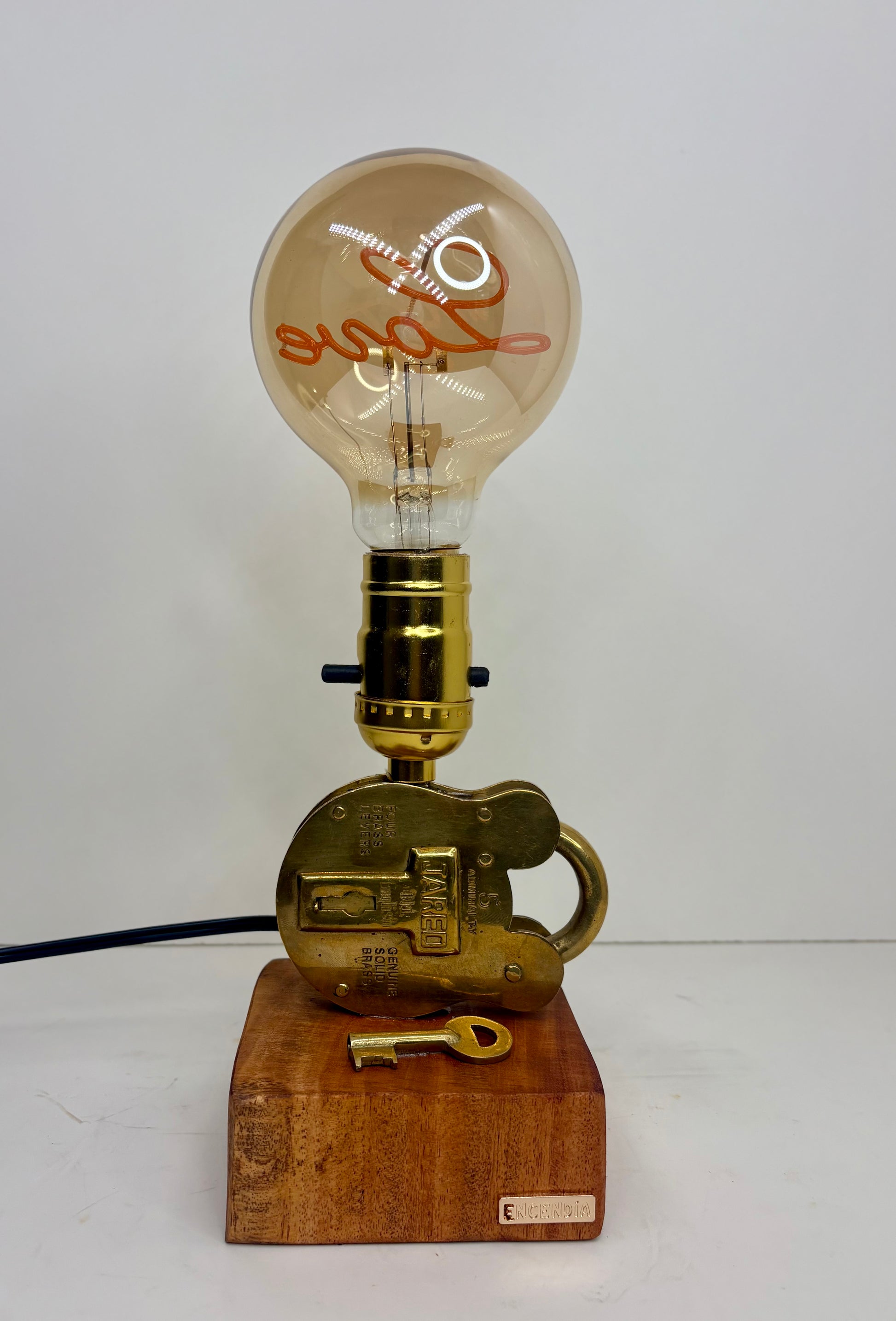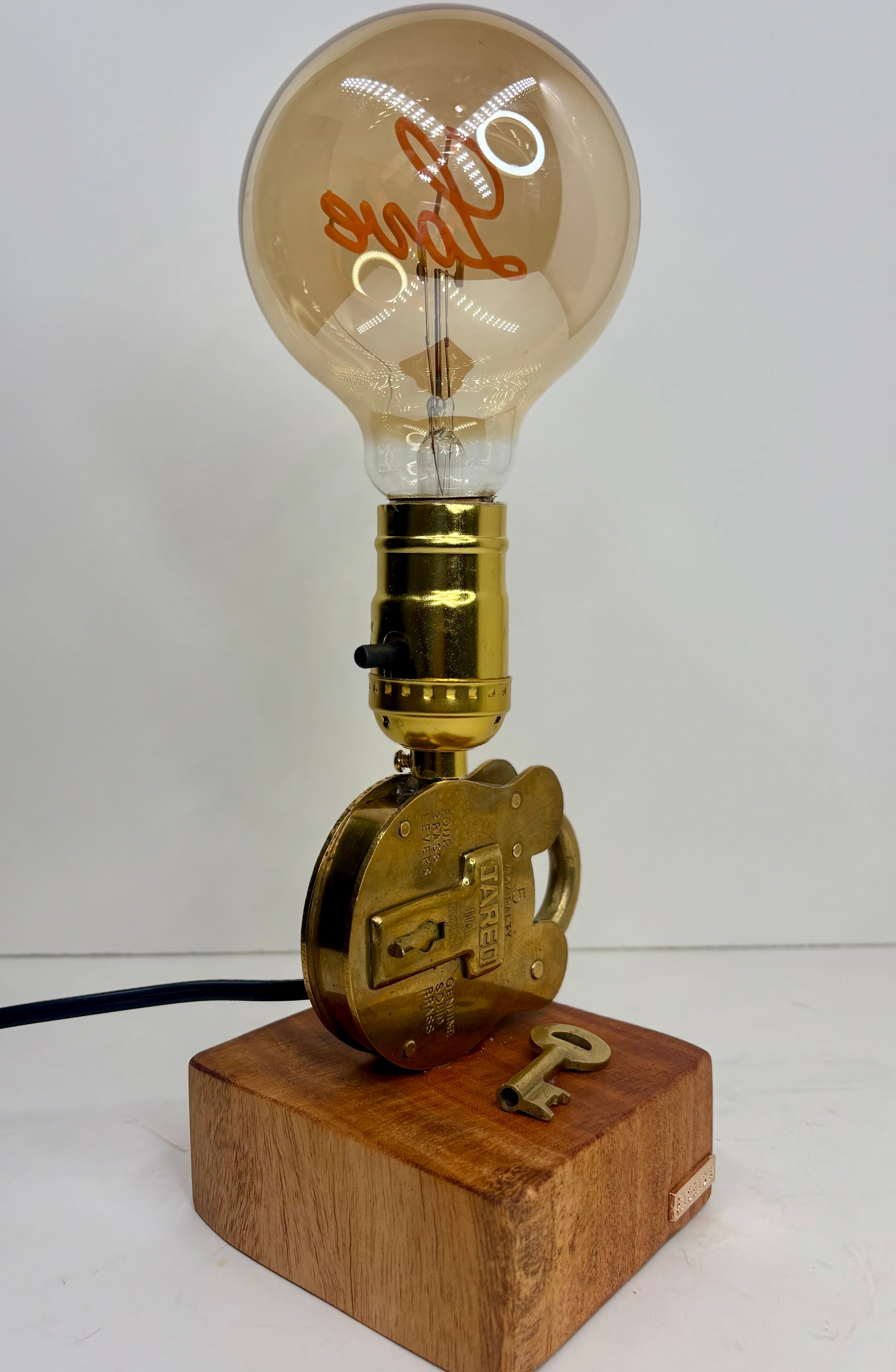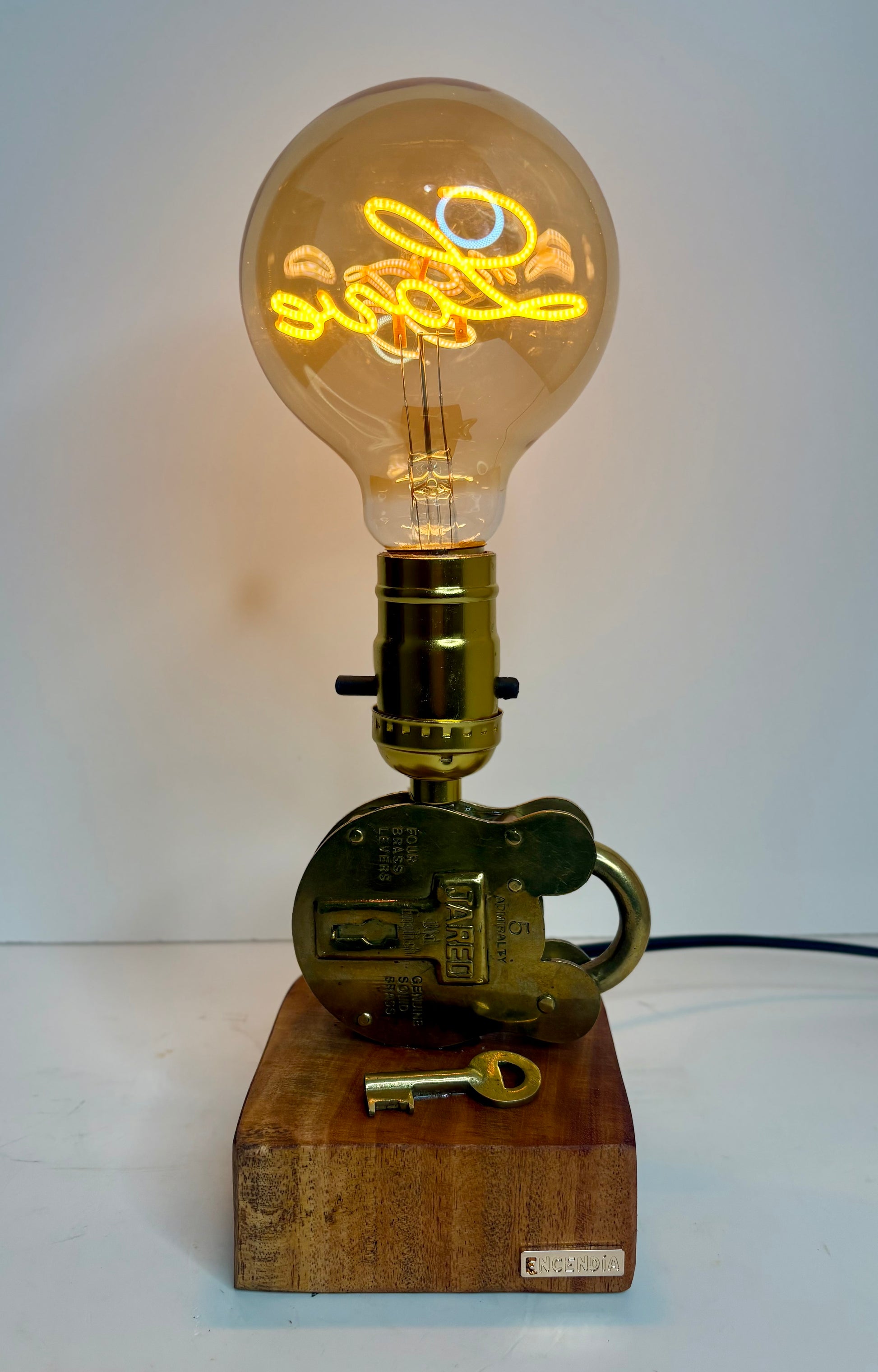 La antigua herramienta de seguridad, conocida como "El Candado", data de miles de años y tiene su origen en la antigua Mesopotamia y Egipto, donde se construía con madera y metal. Al utilizar una hermosa versión de latón de esta cerradura, la hemos transformado en un símbolo de amor, hecha de madera de acacia amarilla recuperada y con una bombilla de filamento LED en forma de corazón.